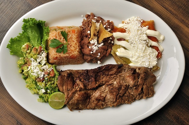 Bistec 220g con arroz, frijoles y 2 enchiladas